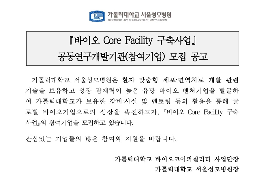 [공고문] 2025년 서울성모병원 바이오 Core Facility 구축사업 참여기업 모집 공고문.hwp (다운로드 : 72회)