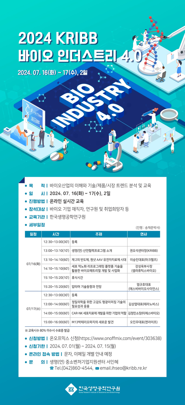 한국생명공학연구원에서 바이오산업 이해와 기술/시장/시장/제품 트랜드 분석 및 교육을 목적으로 [2024 KRIBB 바이오 인더스트리 4.0]를 개최합니다.