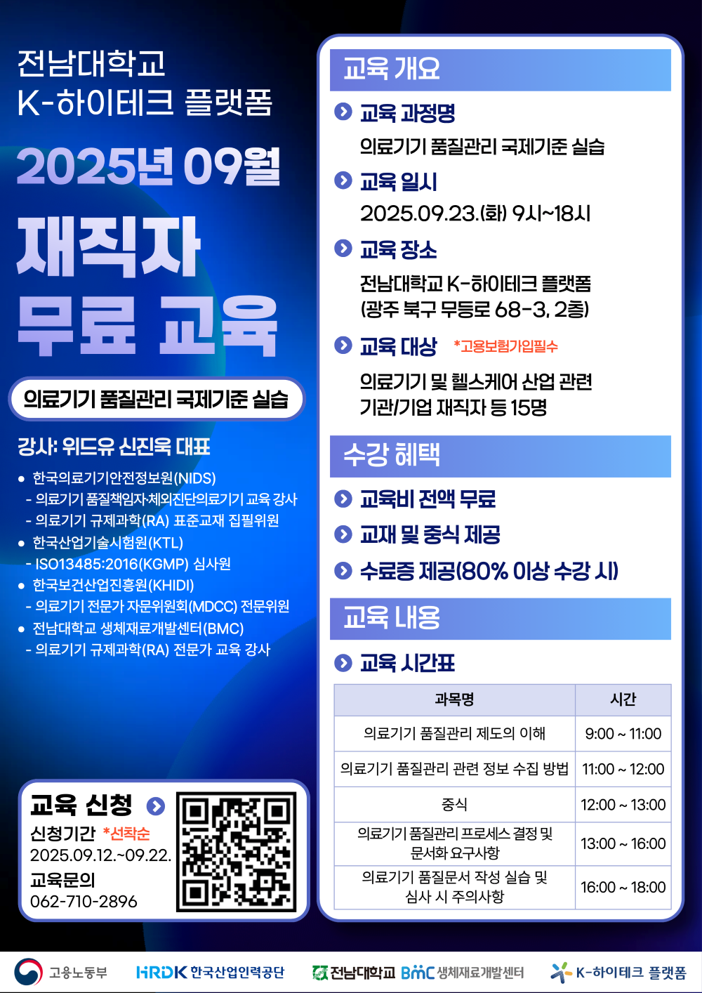 [전남대학교 생체재료개발센터] 2025년 9월 의료기기 품질관리 국제기준 실습 무료 교육(9/23)